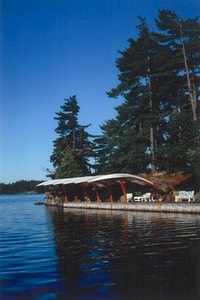 The Pine Island boat canopy was designed to provide a covered mooring for two boats alongside a dock that lies parallel to the shoreline of the island. The one-acre island lies just inside US waters along the Canadian Middle Channel of the St. Lawrence River. The design was conceived in 1992 but was not developed and executed until 1997.